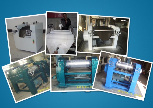 該設(shè)備由三個輥筒組成,裝在一個機(jī)架上,由電機(jī)直接帶動。一般輥筒間的轉(zhuǎn)動方向不同,前輥向前轉(zhuǎn)動,中輥向后轉(zhuǎn)動。輥?zhàn)愚D(zhuǎn)速前輥快、后輥慢。中間輥固定,前后兩輥裝在滑道上,有彈簧裝置,用手輪調(diào)節(jié)前后輥與中輥的距離。物料由后輥與中輥之間進(jìn)入,受到輥筒的擠壓,產(chǎn)品顆粒變細(xì),然后由快輥帶出,快輥末端裝有刮刀,使物料與輥筒分離,落入收集桶內(nèi)。由于研磨過程產(chǎn)生大量熱量,各輥筒的中心是設(shè)計(jì)為空心結(jié)構(gòu),通水冷卻,保證產(chǎn)品質(zhì)量。